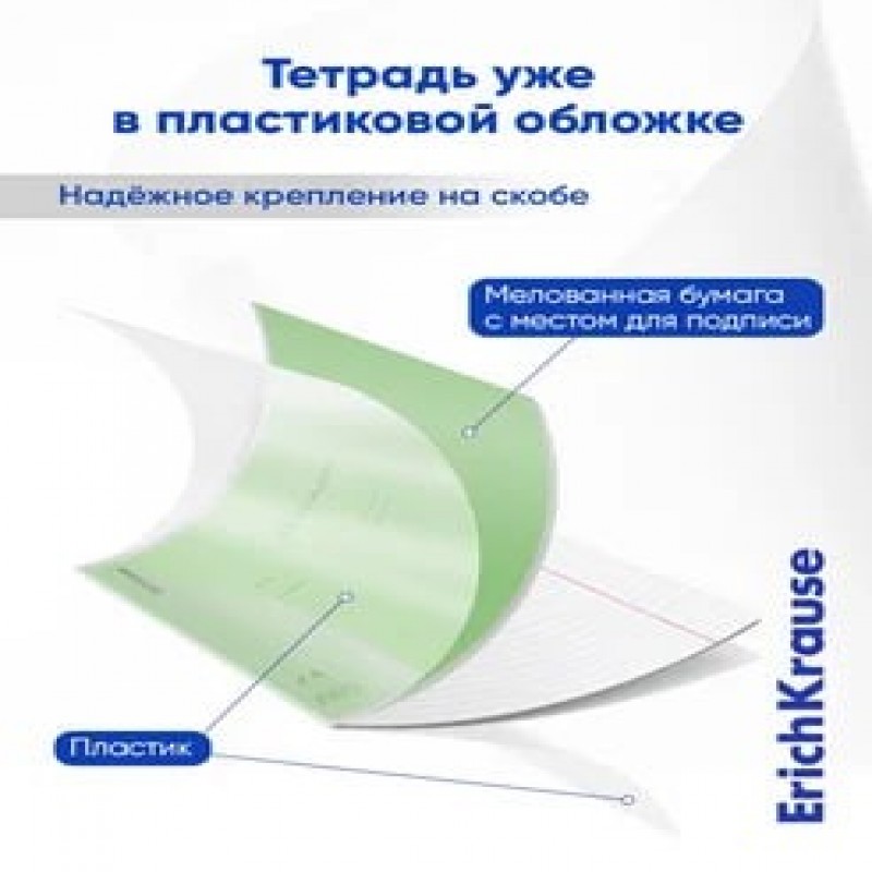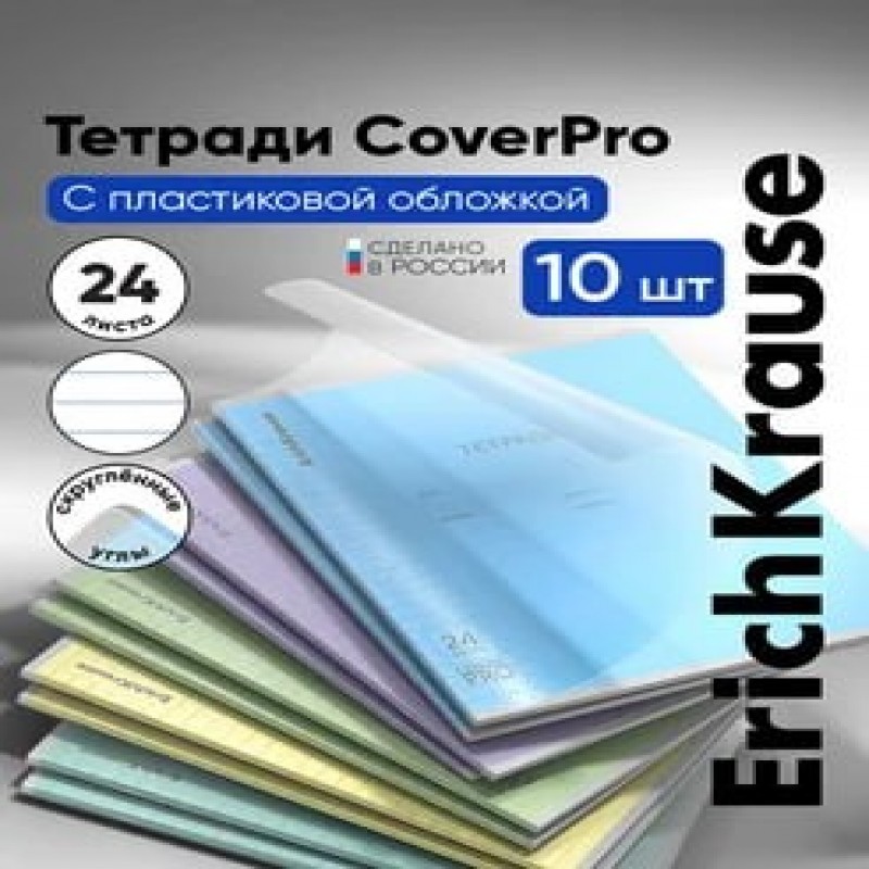 Тетрадь с пластиковой обложкой CoverPro от ErichKrause — это надёжная защита и стильный дизайн в одном решении. Тетрадь оснащена двойной обложкой: прочный пластик снаружи и гладкая мелованная бумага внутри. Тетрадь с обложкой CoverPro сохранит школьные записи в идеальном состоянии и защитит от любых неприятностей: влаги, царапин и замятия в рюкзаке или ранце. Вам больше не придётся тратиться на приобретение отдельных обложек. Пластиковая обложка имеет оптимальную плотность 180 мкм: достаточно прочная для надёжной защиты, но при этом гибкая и безопасная даже для самых маленьких школьников. Текстура поверхности "апельсиновая корка", на которой не видны отпечатки и мелкие царапины. Тетрадь А5 + (170х203 мм) на 5 мм шире стандартных, что дает больше пространства для письма и пометок учителя. Скруглённые углы обеих обложек и каждой страницы не только безопасны, но и предотвращают заломы, сохраняя аккуратный внешний вид тетради на протяжении всего периода использования. Специальная биговка на корешке тетради обеспечивает удобное открывание. Чёткая и тонкая синяя линовка в клетку нанесена на офсетную бумагу 100% белизны плотностью 60 г/м². Линовка каждой страницы идеально совпадает с обеих сторон, что исключает эффект размытия при просвечивании, обеспечивая комфортное письмо. Тетради с обложкой пластиковой представлены в классических цветах. Упаковка из 10 тетрадей защищена термоусадочной плёнкой и плотным пакетом, чтобы ваши тетради приехали в идеальном состоянии. Тетрадь в линейку 24 листа Cover Pro от Erich Krause — идеальный выбор для учебы. Новый уровень удобства и сохранности ваших знаний! Тетради всех цветов и форматов, а также другие канцелярские товары для учебы и работы ждут вас в официальном магазине ErichKrause на Wildberries. Гарантия качества и лучшие предложения!